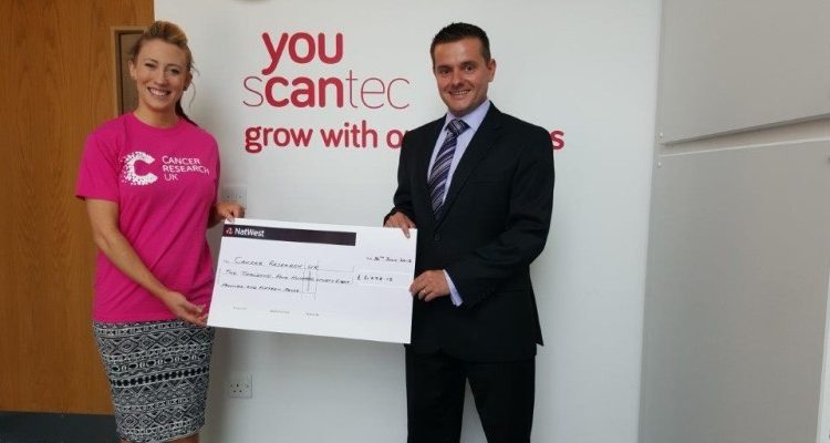 Scantec staff hand over charity cheque from mountain challenge