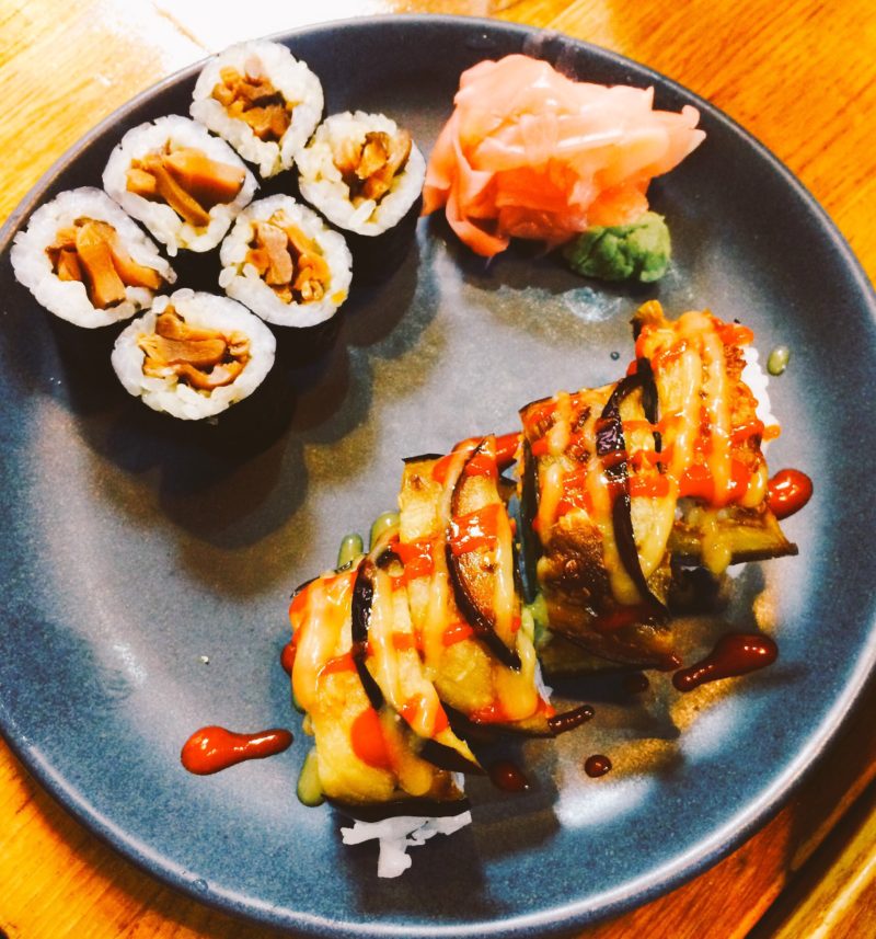 But the star of the show for me was the aubergine uramaki. Uramaki are larger sushi rolls and the aubergine dragon came filled with aubergine (no kidding), green beans, kanpyo (a sort of dried Japanese squash), carrot and chives rolled up inside rice and nori, drizzled with miso & agave sauce and hot sauce and served with takuan, a pickled daikon radish. It was seriously good – fresh, crisp, sweet, savoury, spicy and sour all in one hit! I urge you to try this one on your next visit, you won’t regret it.